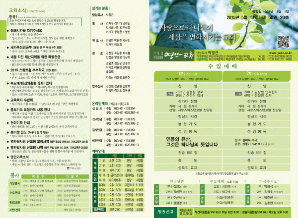 2015년 5월 17일 주보 페이지 정보 작성자 yabc 작성일15-05-16 00:00 조회11,283회 댓글0건 관련링크 목록 본문 2015년 5월 17일 주보 댓글목록 등록된 댓글이 없습니다. 목록