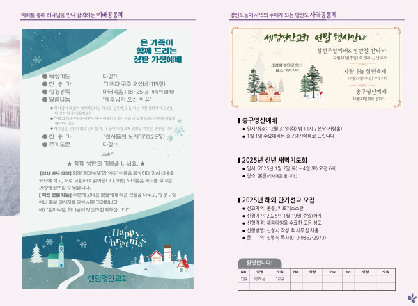 2024년 12월 22일 주보 (센텀예배당) 페이지 정보 작성자 관리지기 작성일24-12-21 11:04 조회2,169회 댓글0건 관련링크 목록 본문 2024년 12월 22일 주보 (센텀예배당) 댓글목록 등록된 댓글이 없습니다. 목록