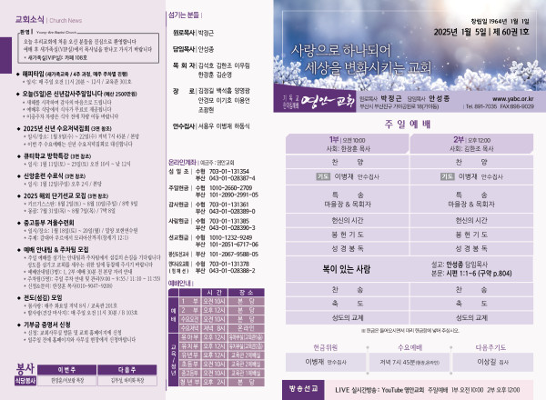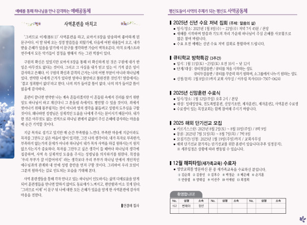 2025년 1월 5일 주보 페이지 정보 작성자 관리지기 작성일25-01-04 11:19 조회2,442회 댓글0건 관련링크 목록 본문 2025년 1월 5일 주보 댓글목록 등록된 댓글이 없습니다. 목록