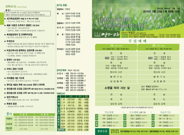 2014년 3월 23일 주보 페이지 정보 작성자 yabc 작성일14-03-22 00:00 조회10,614회 댓글0건 관련링크 목록 본문 2014년 3월 23일 주보 댓글목록 등록된 댓글이 없습니다. 목록