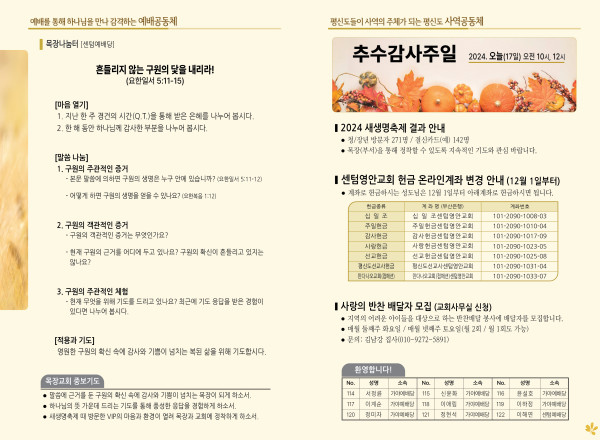2024년 11월 17일 주보 (센텀예배당) 페이지 정보 작성자 관리지기 작성일24-11-16 10:47 조회2,164회 댓글0건 관련링크 목록 본문 2024년 11월 17일 주보 (센텀예배당) 댓글목록 등록된 댓글이 없습니다. 목록