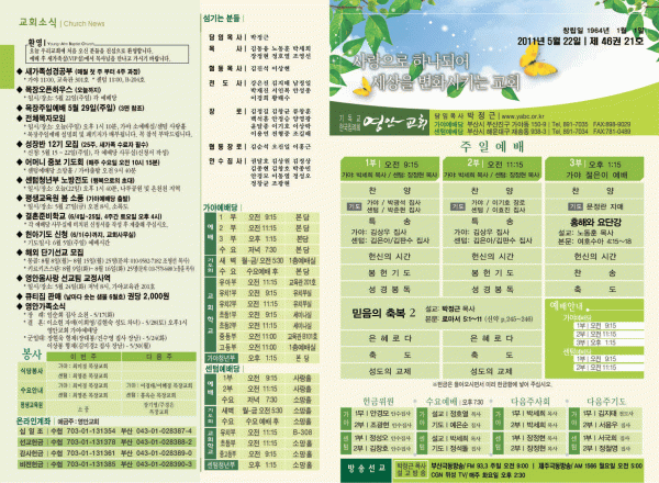 2011년 5월 22일 주보 페이지 정보 작성자 yabc 작성일11-05-21 00:00 조회11,395회 댓글0건 관련링크 목록 본문 2011년 5월 22일 주보 댓글목록 등록된 댓글이 없습니다. 목록