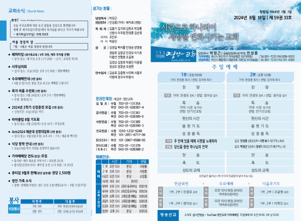2024년 8월 18일 주보 (가야예배당) 페이지 정보 작성자 관리지기 작성일24-08-17 10:40 조회2,421회 댓글0건 관련링크 목록 본문 * 2024년 8월 18일 주보 (가야예배당) 댓글목록 등록된 댓글이 없습니다. 목록