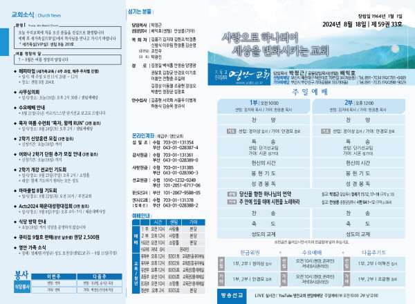 2024년 8월 18일 주보 (센텀예배당) 페이지 정보 작성자 관리지기 작성일24-08-17 10:45 조회2,435회 댓글0건 관련링크 목록 본문 2024년 8월 18일 주보 (센텀예배당) 댓글목록 등록된 댓글이 없습니다. 목록