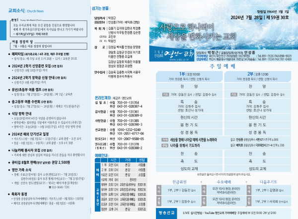 2024년 7월 28일 주보 (가야예배당 페이지 정보 작성자 관리지기 작성일24-07-27 10:44 조회2,531회 댓글0건 관련링크 목록 본문 * 2024년 7월 28일 주보 (가야예배당) 댓글목록 등록된 댓글이 없습니다. 목록