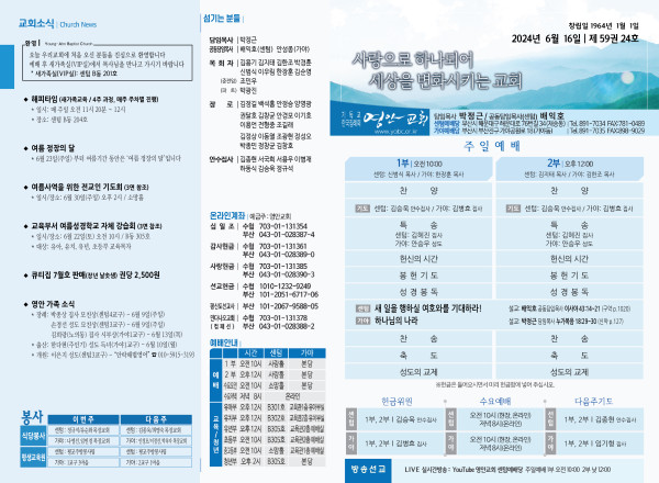 2024년 6월 16일 주보 (센텀예배당) 페이지 정보 작성자 관리지기 작성일24-06-15 10:40 조회2,551회 댓글0건 관련링크 목록 본문 2024년 6월 16일 주보 (센텀예배당) 댓글목록 등록된 댓글이 없습니다. 목록