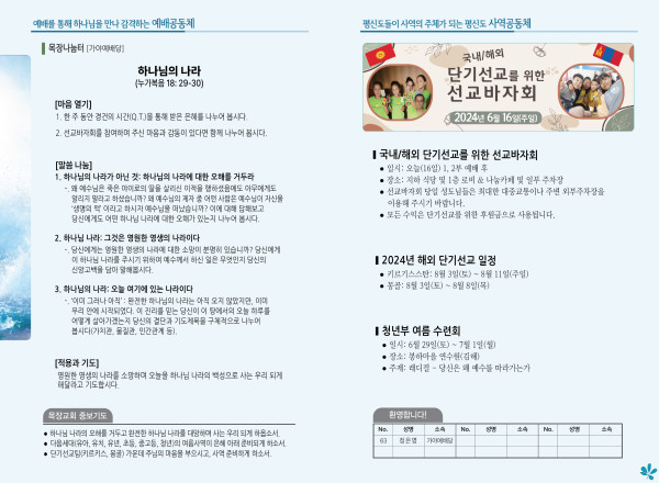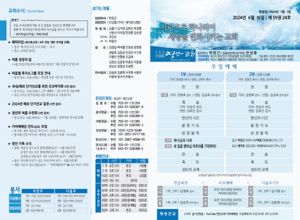 2024년 6월 16일 주보 (가야예배당) 페이지 정보 작성자 관리지기 작성일24-06-15 10:51 조회2,965회 댓글0건 관련링크 목록 본문 2024년 6월 16일 주보 (가야예배당) 댓글목록 등록된 댓글이 없습니다. 목록