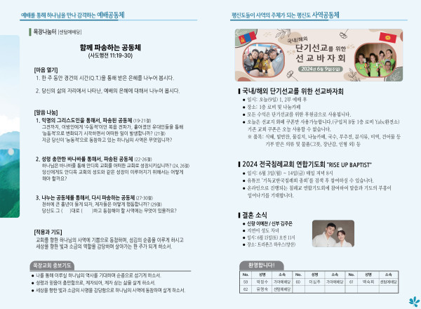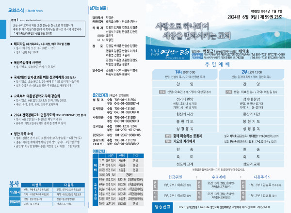 2024년 6월 9일 주보 (센텀예배당) 페이지 정보 작성자 관리지기 작성일24-06-08 10:44 조회2,602회 댓글0건 관련링크 목록 본문 2024년 6월 9일 주보 (센텀예배당) 댓글목록 등록된 댓글이 없습니다. 목록