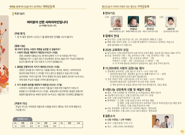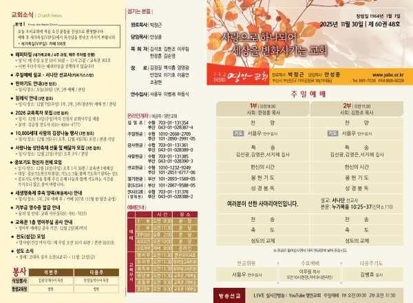 2025년 11월 30일 주보 페이지 정보 작성자 관리지기 작성일25-11-29 10:42 조회855회 댓글0건 관련링크 목록 본문 2025년 11월 30일 주보 댓글목록 등록된 댓글이 없습니다. 목록