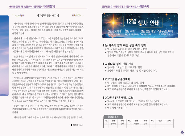 2025년 12월 21일 주보 페이지 정보 작성자 관리지기 작성일25-12-20 10:14 조회1,007회 댓글0건 관련링크 목록 본문 2025년 12월 21일 주보 댓글목록 등록된 댓글이 없습니다. 목록