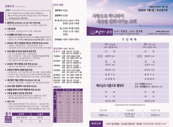 2026년 2월 1일 주보 페이지 정보 작성자 관리지기 작성일26-01-31 09:52 조회896회 댓글0건 관련링크 목록 본문 2026년 2월 1일 주보 댓글목록 등록된 댓글이 없습니다. 목록